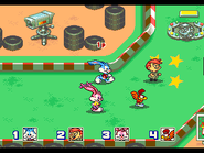 Only Buster, Babs, Plucky, and Hamton can play this game. Race three laps through a course filled with obstacles to see who finishes first. Move the character using the D-pad while repeatedly pressing the A or C buttons. The faster you press, the faster you run. Items fall at fixed positions throughout the course to make the characters speed up, slow down, change position with another character, or become invincible against enemies. Since items are always changing their appearance, you never know their effects until you get them. When slow-running characters find themselves near the end of the screen, they are automatically returned to the center of the screen for a one-second penalty. In story mode, you play as Buster Bunny, while your opponents are Montana Max, Babs Bunny, and Little Beeper.