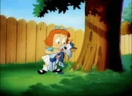 Elmyra, actually being serious, threatens to kick Furrball out of her house if she catches him eating Sweetie