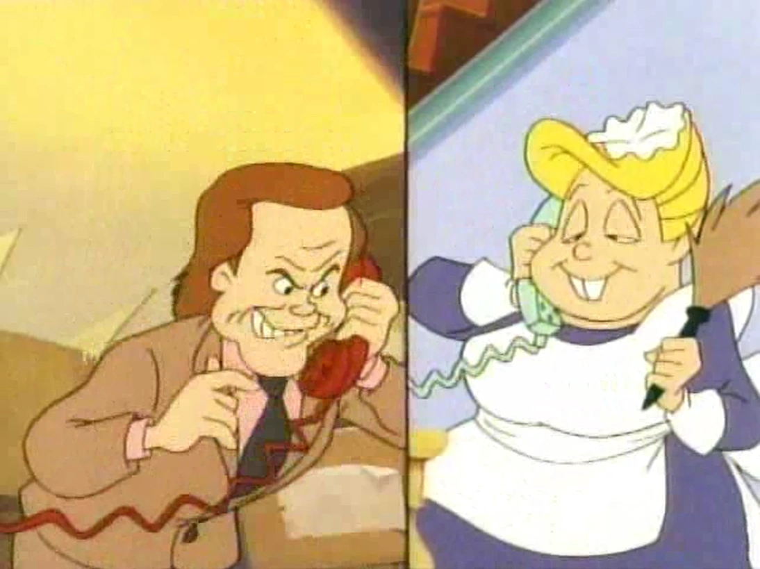 She seems oblivious to most things, but does do what the Duffs tell her to do. An example of her obliviousness is shown when she answers the phone and Elmyra's kidnappers inform her that they will not see Elmyra again until they get Mac's formula, which she responds with Okay...Bye-bye (a phrase she says quite often, as well as Okay...Thank you), hangs up the phone and walks away. She also appears to be very strong, shown when she goes to get the door for a news reporter, ripping it off of its hinges and walking away with it. When she goes to put it back on, the cameraman steps on it and squashes her underneath it. She appears one last time with the Duff family on a newscast interviewing Elmyra after she's freed of the kidnappers.