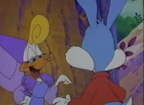 After Buster and Babs land in medieval times because the time machine ran out of fuel, Buster encounters her tied to a tree and rescues her. He asks her if she knows anything that makes fire, and she points to Foghorn Draghorn, a dragon that resembles Foghorn Leghorn and is probably his ancestor.