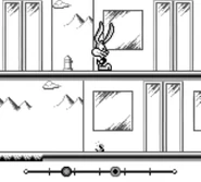 4. Monty's Mansion - To get to Monty's mansion, you must first travel through the rest of the forest. Calamity Coyote owns a factory, where he has built a rocket-powered bicycle. Buster is the only one who volunteers, as Plucky doesn't think the bicycle is safe, and Hamton doesn't want to fall off and get dirty. As Buster leaves, Calamity gets burned by the tailpipe. On his way to Monty's mansion, Buster must outrun Elmyra Duff.